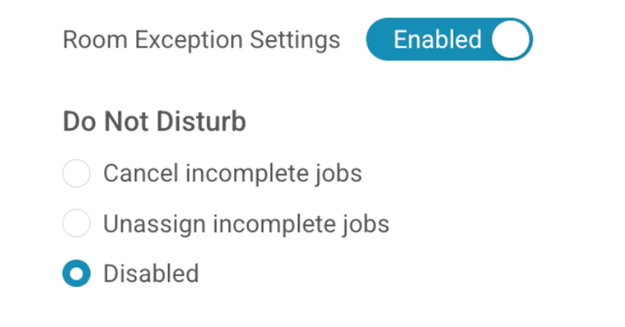 When a user sets a room status to Do Not Disturb (DND) in Ius, you have three configuration choices for how the system should react to any existing incomplete jobs for that room: