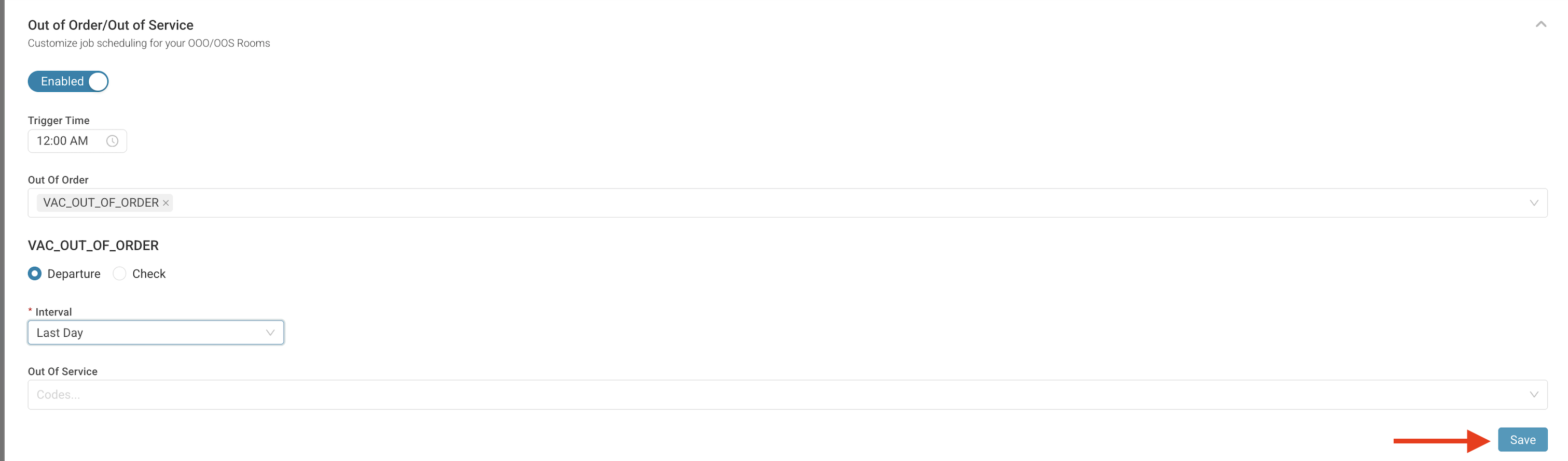 This feature is triggered when a user places a room into an OOO/OOS status using a specific code in the Property Management System (PMS). When this feature is Enabled, Optii looks at the OOO/OOS period (start date to end date) set in the PMS and automatically schedules a job (Departure or Check) based on your chosen Interval.