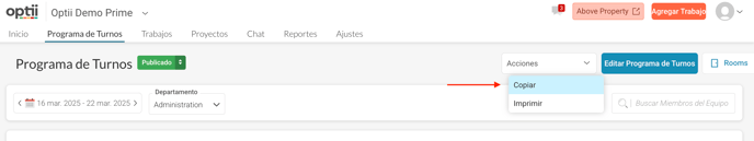 Ahorra tiempo creando tu nuevo horario semanal copiando el horario de la semana anterior utilizando la función "Copiar" en el menú desplegable "Acciones".