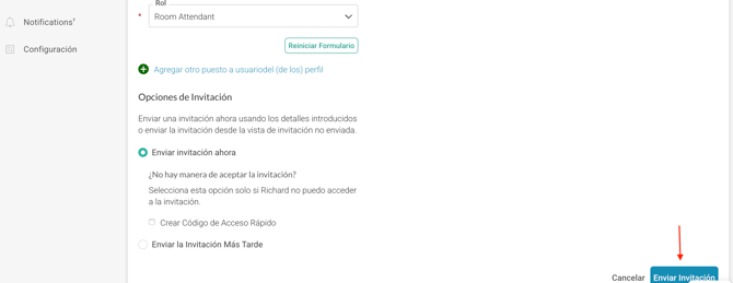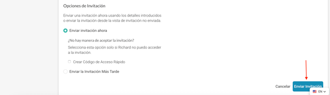 - Enviar Invitación: Una vez que hayas ingresado toda la información, haz clic en "Enviar Invitación" en la esquina inferior derecha. El usuario recibirá un correo electrónico de invitación para completar la configuración de su perfil.