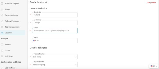 Ejemplo: Si tu correo electrónico es richard@housekeepings.com, puedes crear un usuario como ricardo+nuevousuario@housekeepings.com.