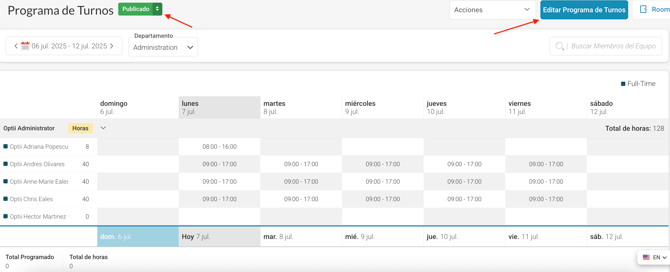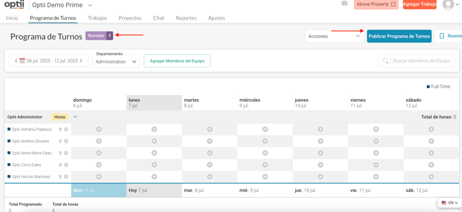 Añadir Miembros del Equipo en Vista de Borrador: Puedes añadir miembros del equipo al horario usando el botón "Añadir Miembros del Equipo" mientras estás en la vista "Borrador". Usa las flechas hacia arriba y hacia abajo para alternar entre las vistas "Publicado" y "Borrador".