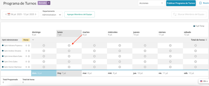 • Haz clic en el cuadro azul "Guardar Miembros del Equipo" en la parte inferior de la pantalla. Esto abre una plantilla de horario donde puedes añadir turnos y horas.