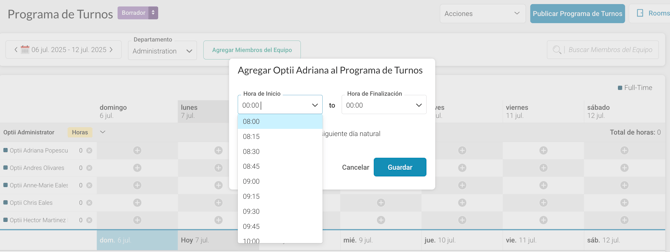 • Aparecerá un cuadro emergente que te permitirá elegir las horas de inicio y fin del turno en incrementos de 15 minutos.