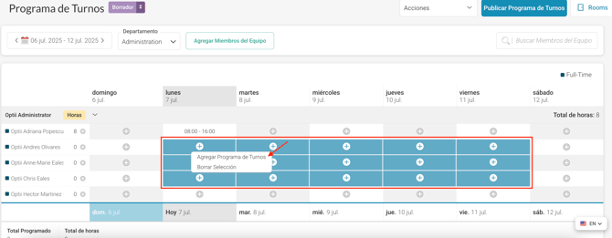 • Selección Múltiple para Miembros del Equipo: Usa esta opción para programar varios miembros del equipo simultáneamente o para editar horarios existentes para varios miembros del equipo.