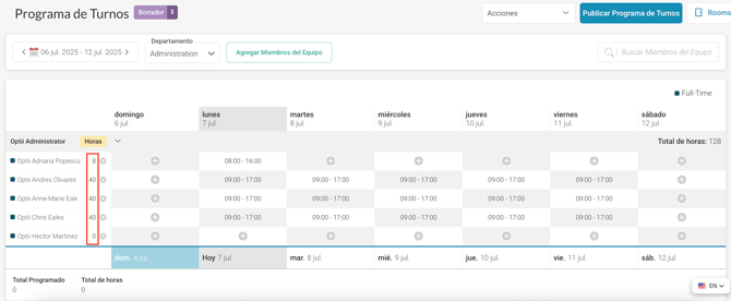 • El botón "Horas" junto al nombre de cada miembro del equipo muestra el total de sus horas programadas.