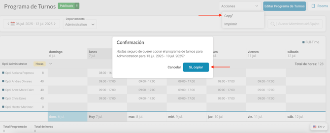 Copiar Horarios: Ahorra tiempo copiando el horario de la semana anterior. Usa la función "Copiar" en el menú desplegable "Acciones". Haz clic en "Sí, Copiar" para crear automáticamente una versión de borrador para la semana siguiente.