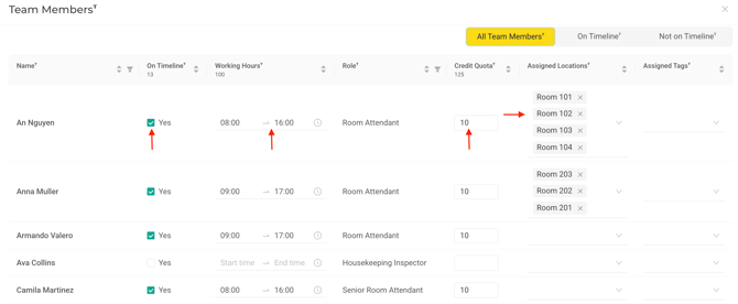 Vista Simplificada: Ofrece una visión general rápida del nombre de cada camarista y sus créditos asignados, ideal para una instantánea de alto nivel de las asignaciones diarias.