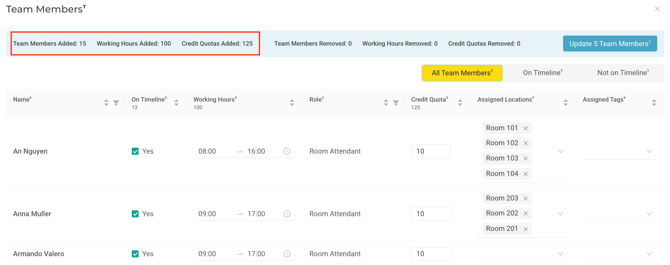 Introducir Detalles: Introduce la Hora de Inicio y Fin, Crédito y/o ubicaciones asignadas para cada miembro del equipo.