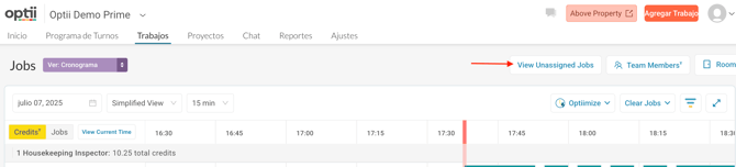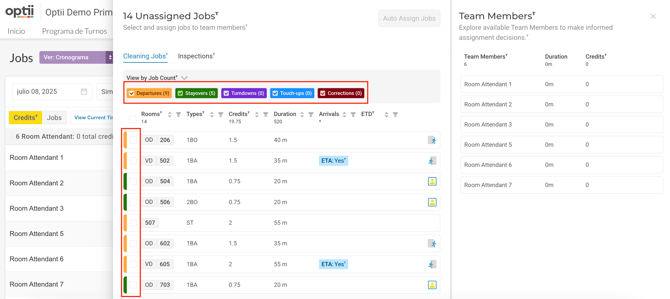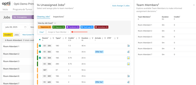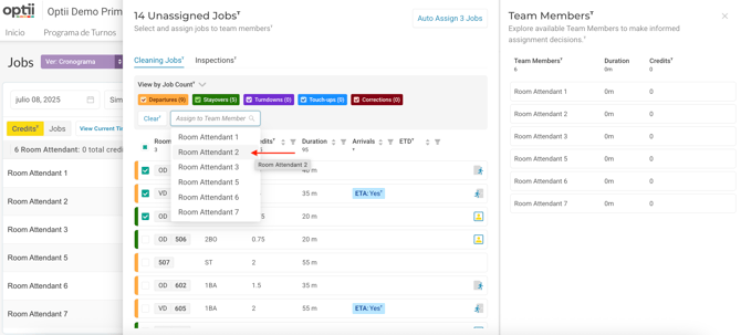 Repetir: Continúa asignando habitaciones hasta que todos los trabajos estén asignados. Optii te notificará cuando no haya trabajos sin asignar.