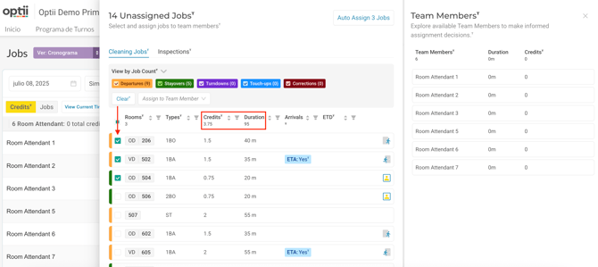 Seleccionar Habitaciones: Marca las casillas de las habitaciones que deseas asignar a una camarista. Optii actualiza el número de créditos y la duración seleccionada.