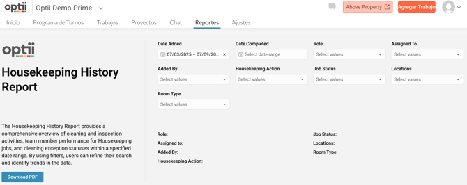 Comprender el propósito: Entender por qué el Reporte de Historial de Ama de Llaves (Housekeeping History Report) es esencial para gestionar y analizar las actividades del departamento.