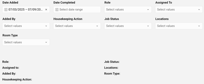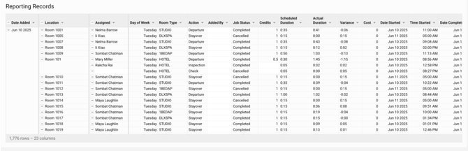 Utilizar Filtros Potentes: Dominar cómo usar varios filtros (Fecha de Adición/Finalización, Rol, Asignado A, Añadido Por, Acción de Limpieza, Estado del Trabajo, Ubicaciones, Tipo de Habitación) para identificar datos y tendencias específicos. Aprender cómo estos filtros permiten el análisis de tendencias, la evaluación del rendimiento, la asignación de recursos y la identificación de problemas.