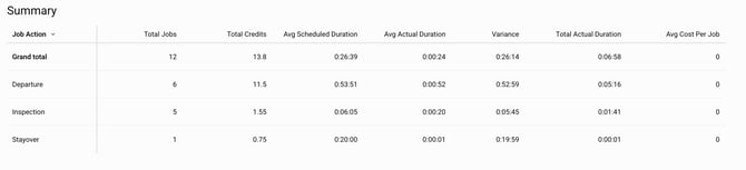 Interpretar Estadísticas Resumen: Comprender la visión general de alto nivel de la actividad de limpieza, incluyendo recuentos para varios tipos de trabajos, créditos, duraciones promedio programadas/reales, varianza y costo promedio por trabajo. Descubrir cómo estas estadísticas ayudan con el monitoreo de la eficiencia, el control de costos, la medición de la productividad y el establecimiento de objetivos.