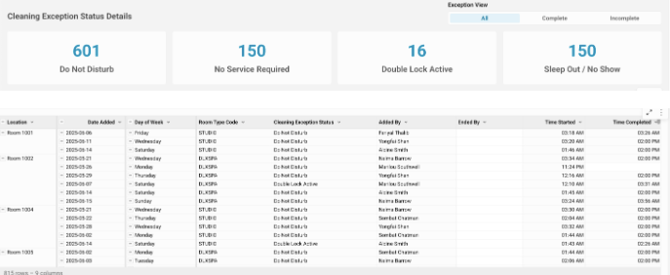 Explorar la tabla de estados de excepción de limpieza: Analizar registros detallados de las excepciones, incluyendo ubicación, fecha, tipo de habitación, estado, quién inició/finalizó el reporte y horarios. Comprender cómo esta tabla ayuda al análisis de causa raíz, la mejora de procesos y la comunicación.