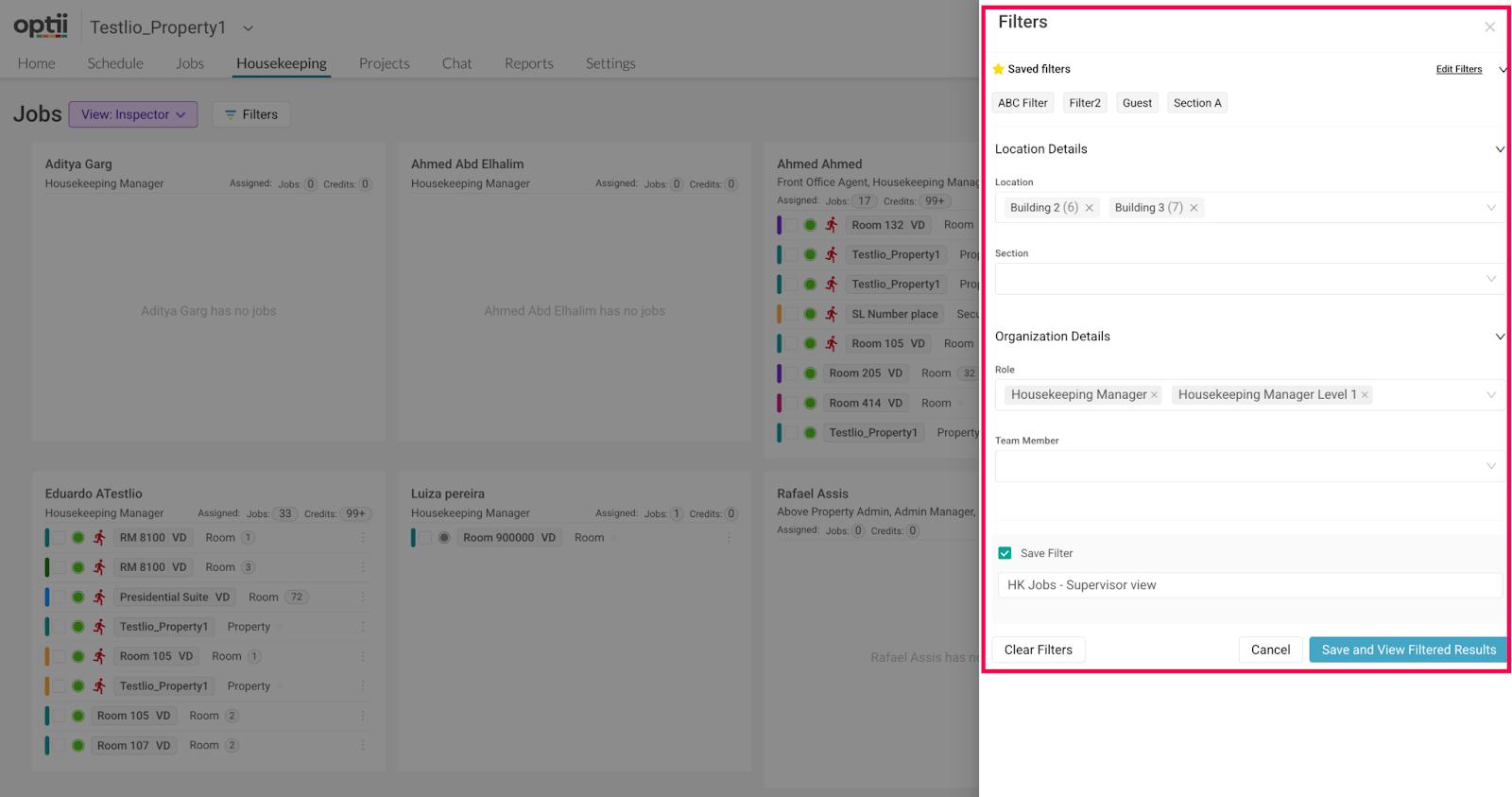 - Filtrado avanzado por Ubicación, Sección, Rol o Miembro del equipo.
