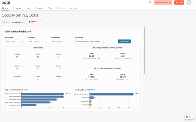 Then we have Jobs, which is the service module in Optii. In this view, you'll see the progress and status of all your guest or internal jobs.