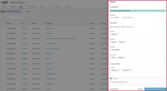 - Flexible Filtering Options - Filter by common job attributes such as date range, job type, action, status, priority, and location (availability may vary by view).